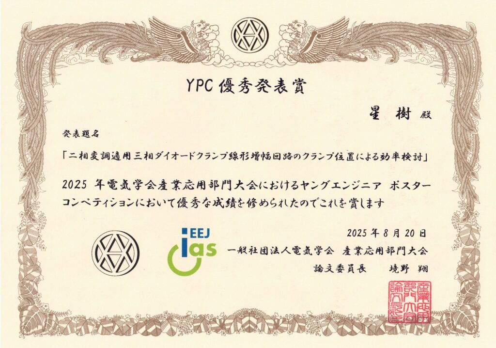 受賞者:星 樹 地域創生科学研究科 博士前期課程工農総合科学専攻情報電気電子システム工学プログラム2年学協会名:一般社団法人 電気学会受賞名:2025年産業応用部門大会YPC優秀論文発表賞題目:二相変調適用三相ダイオードクランプ線形増幅回路のクランプ位置による効率検討受賞年月日:2025年8月20日指導教員:船渡 寛人 教授