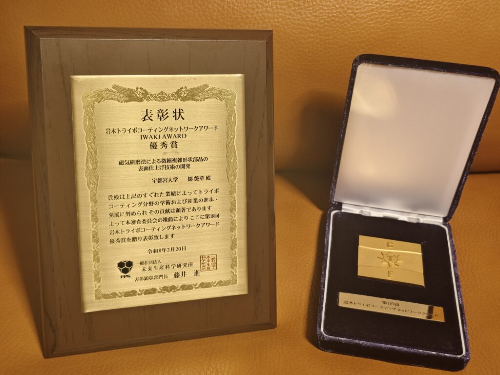 機械システム工学コース鄒 艶華 教授が、未来生産科学研究所 第18回岩木トライボコーティングネットワークアワード(岩木賞)優秀賞を受賞しました。