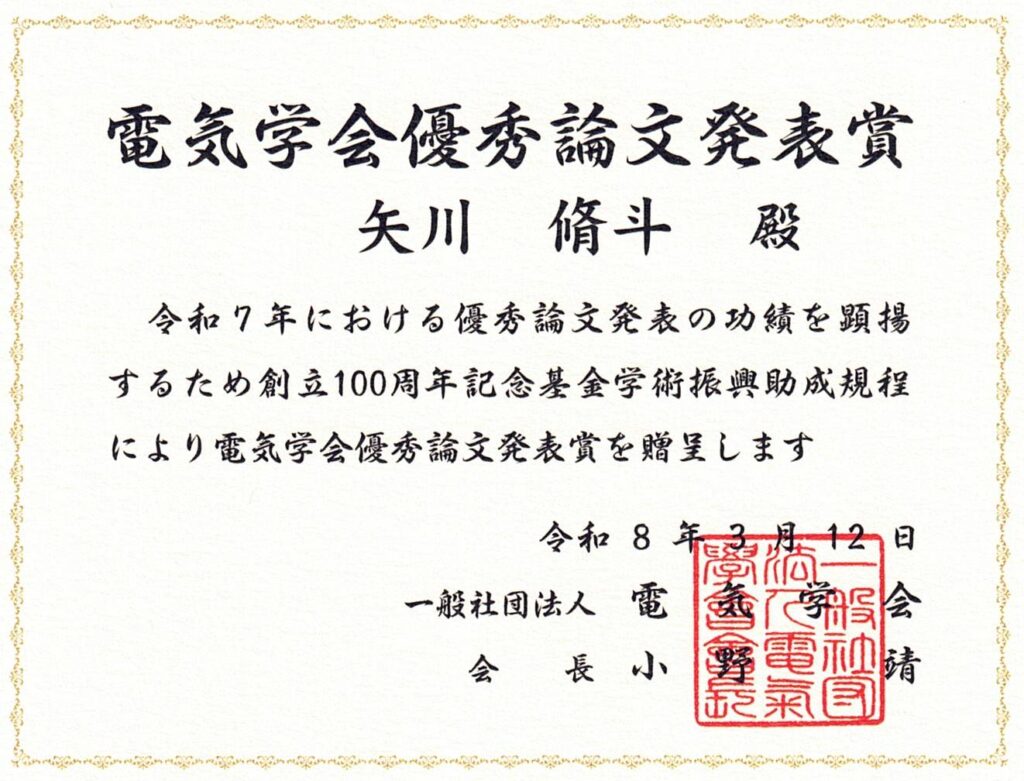 地域創生科学研究科 博士前期課程 工農総合科学専攻情報電気電子システム工学プログラム 2年学協会名:一般社団法人 電気学会受賞名:令和8年電気学会全国大会 優秀論文発表賞題目:回生運転と直流電源数の低減が可能なアクティブクランプ線形増幅回路の提案受賞年月日:2026年3月12日指導教員:船渡 寛人 教授