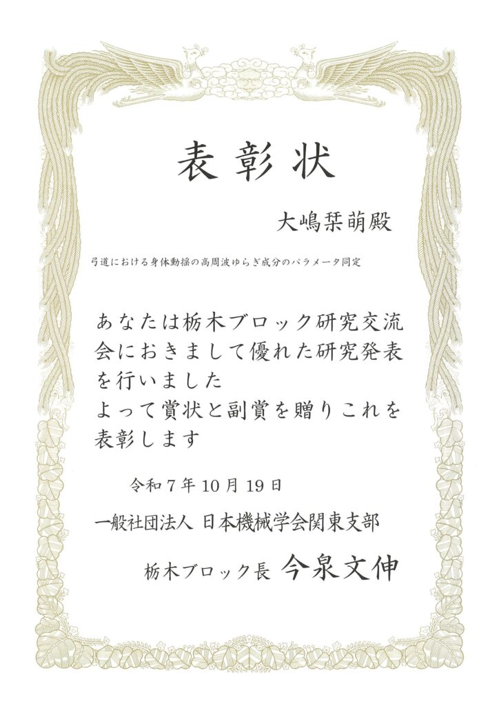 (地域創生科学研究科 博士前期課程工農総合科学専攻機械知能工学プログラム 2年)学協会名:一般社団法人 日本機械学会関東支部栃木ブロック受賞名:栃木ブロックフェア優秀研究発表表彰題目:弓道における身体動揺の高周波ゆらぎ成分のパラメータ同定受賞年月日:2025年10月19日